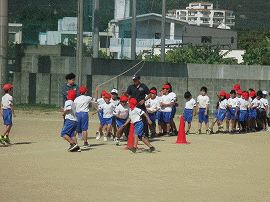 | 5月8日(木) 【体力テストの様子】 ・体力テスト頑張ってます!!50m走、ボール投げ、シャトルラン他・・・ ・1、2年生は5、6年生がサポートしながら頑張っています! |