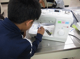 | 2月13日(金) 家庭科の授業(エプロン作り)の様子【5学年】 ・ミシンの糸が絡まったり、縫いがずれたりと苦戦しながらも協力して取り組んでいました。 |