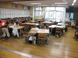 | 11月5日(水) 町地震・津波避難訓練の様子 ・机の下で身の安全を確保し、避難場所へ移動、安否確認まで訓練を行いました。 |