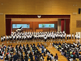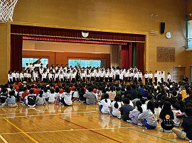 | 11月18日(火) 地区音楽発表会推戴式の様子【6学年】 ・全校朝会で、学校の代表として地区音に参加する6年生が合唱を披露しました。 ・本番(11月21日)も頑張って下さい!! |